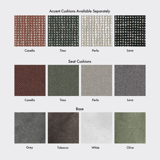 4 seat colours, 4 frame finishes & 4 accent cushion fabrics.