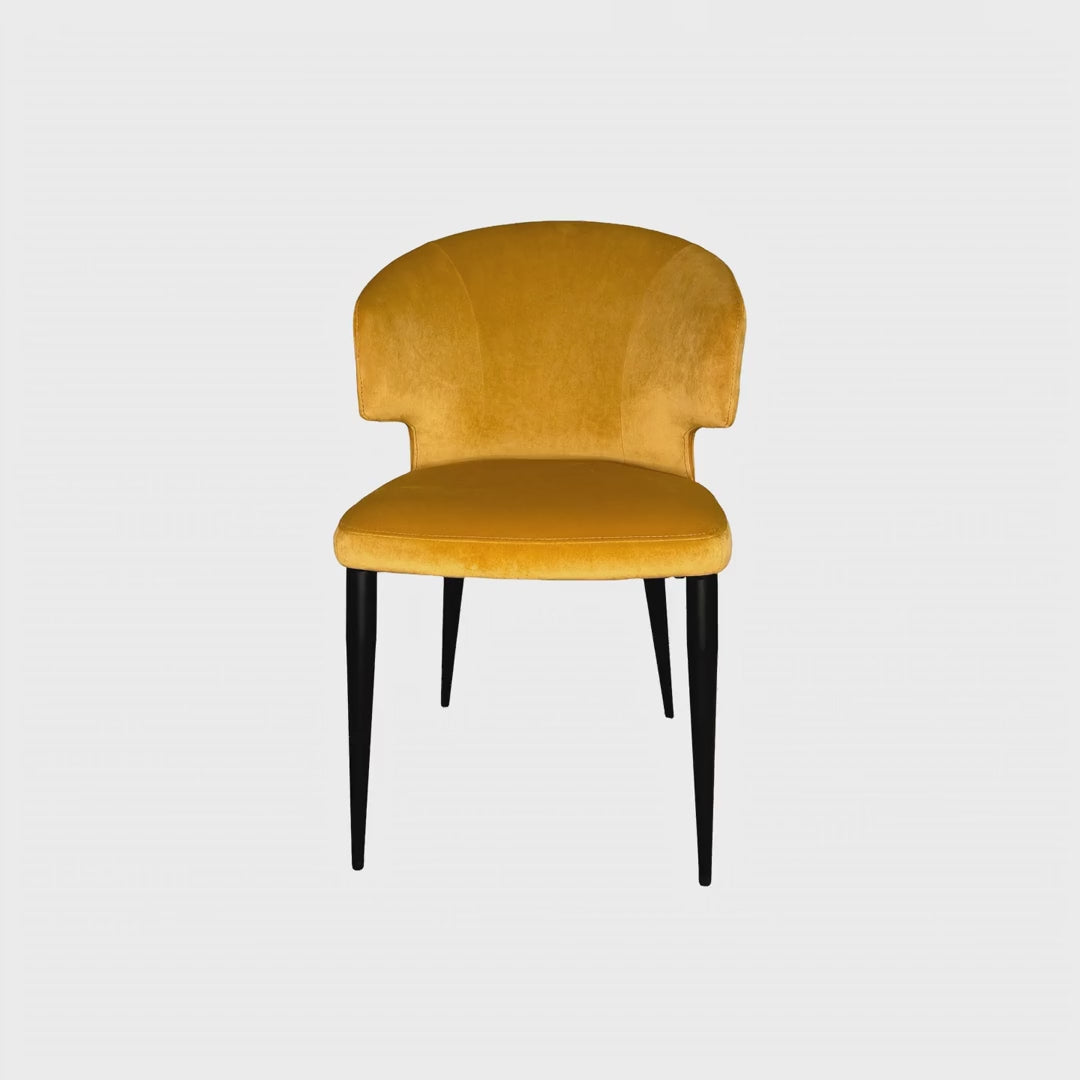 Upholstered in sumptuous mustard yellow velvet, this pair of dining chairs combines tactile luxury with contemporary design. Supported by sleek black metal legs, each chair delivers both visual warmth and structural refinement—ideal for anchoring a modern dining space with colour and texture. Available in additional colourways to suit your interior palette.