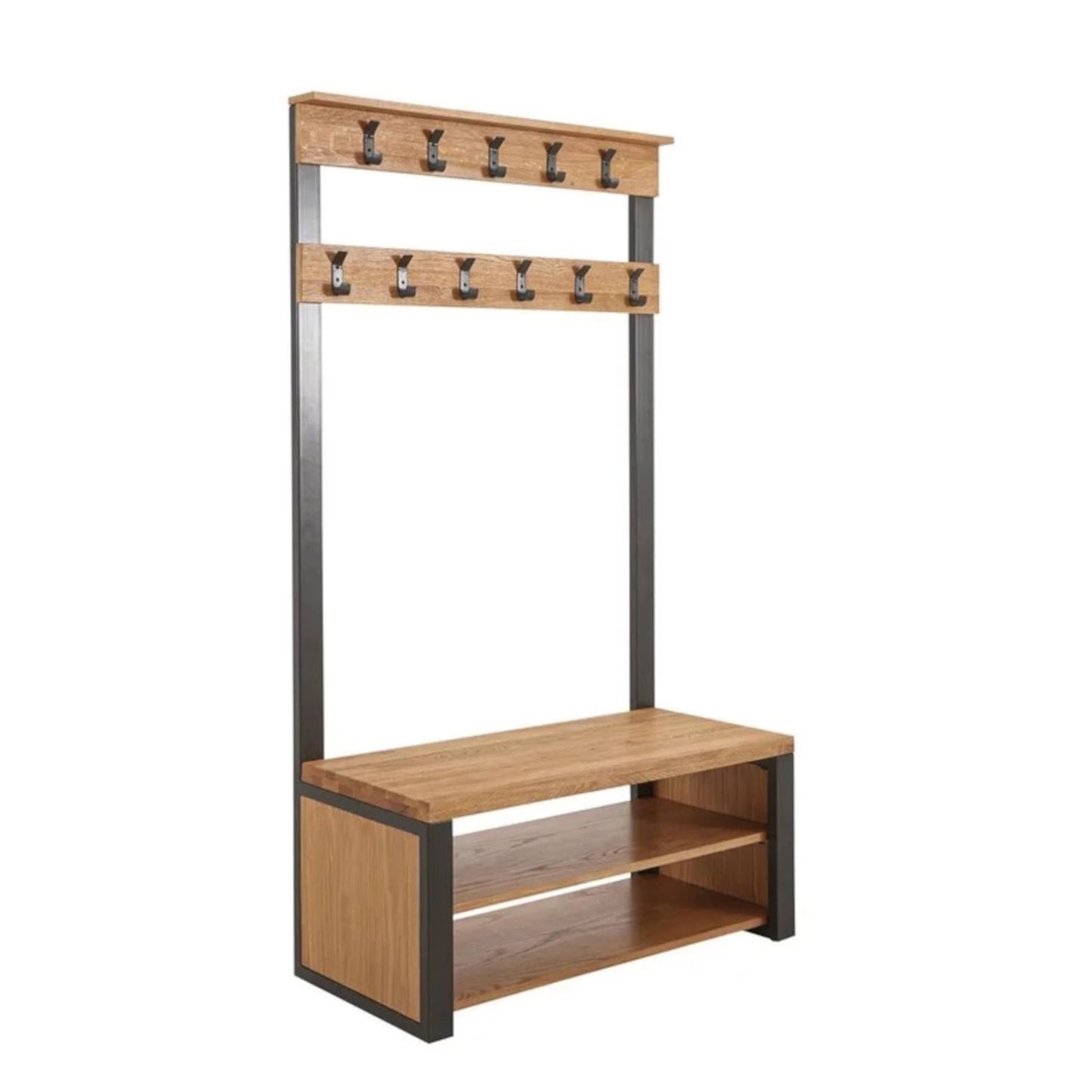 Designed to deliver maximum storage in your hallway and entryway spaces. Featuring a coat hook, hallway bench, and two shelves, it is made from solid oak and has a satin lacquered finish to provide added protection to an industrial style. Optimise storage and elevate your home's style with this must-have hall bench.
