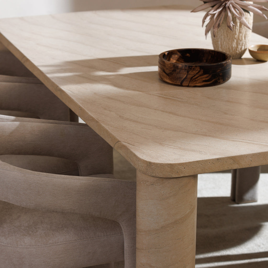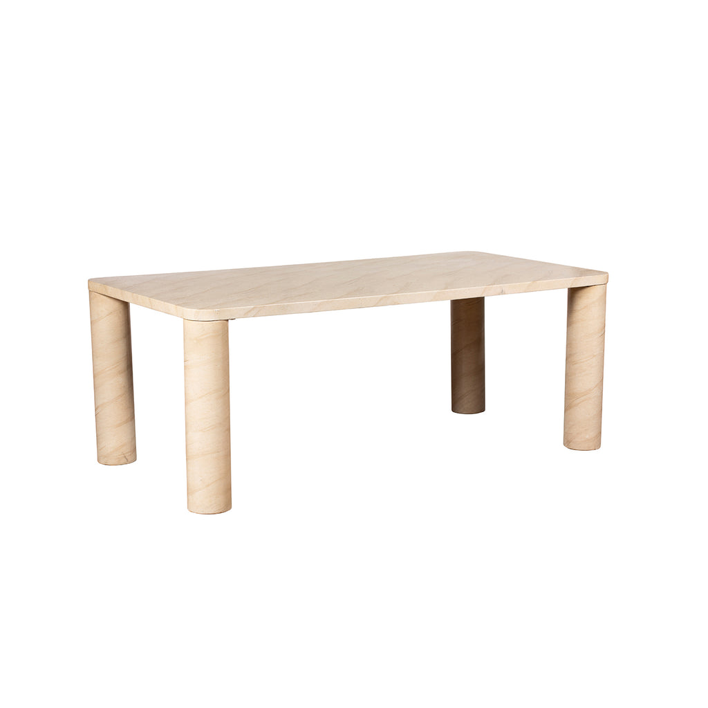 Upgrade your dining experience with the Emile dining table. Measuring at 150cm wide, this elegant table is ideal for gatherings and meals with loved ones. Made with faux travertine concrete, it adds a touch of sophistication to any dining space. Elevate your home with this stylish and functional piece.