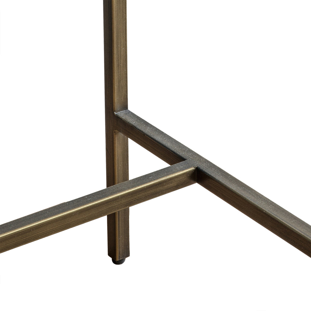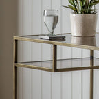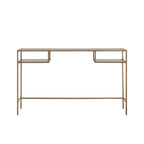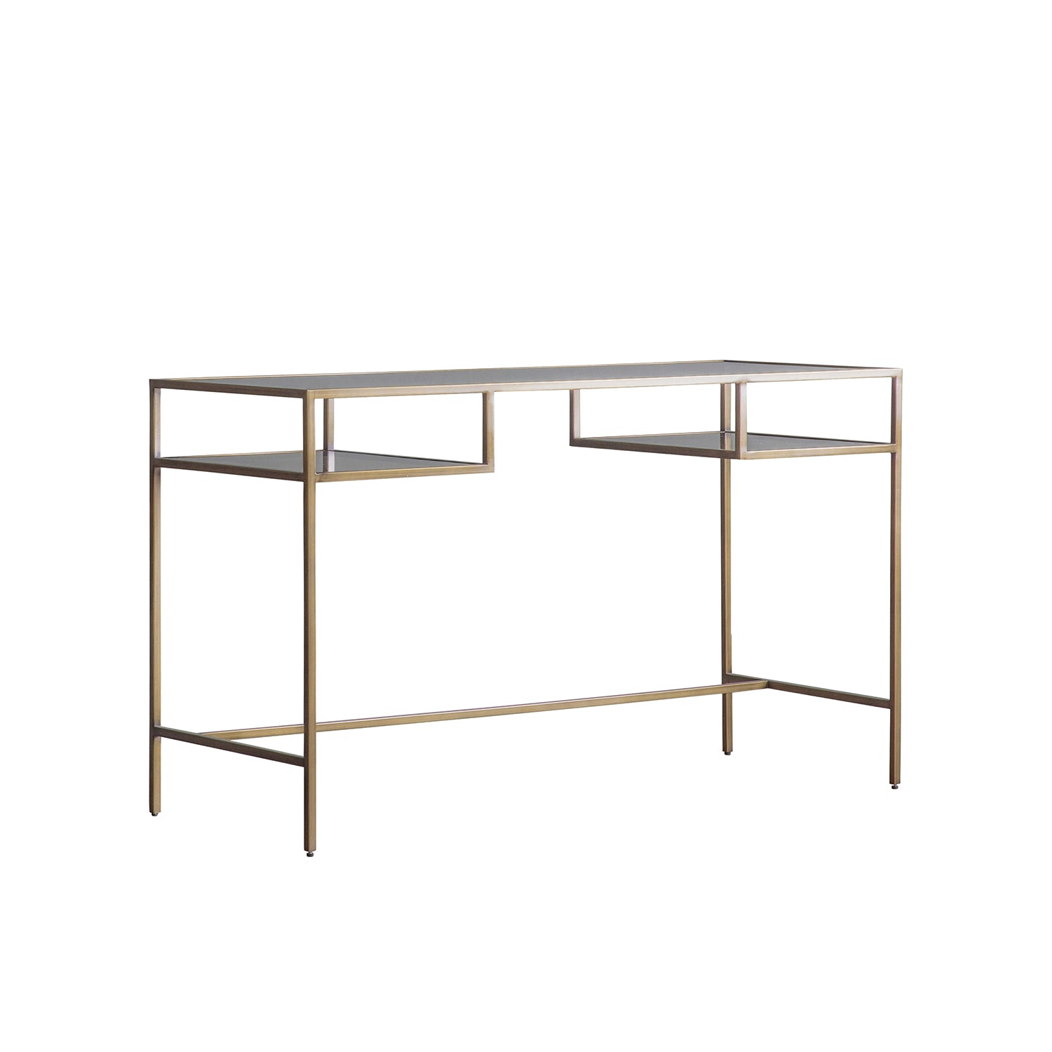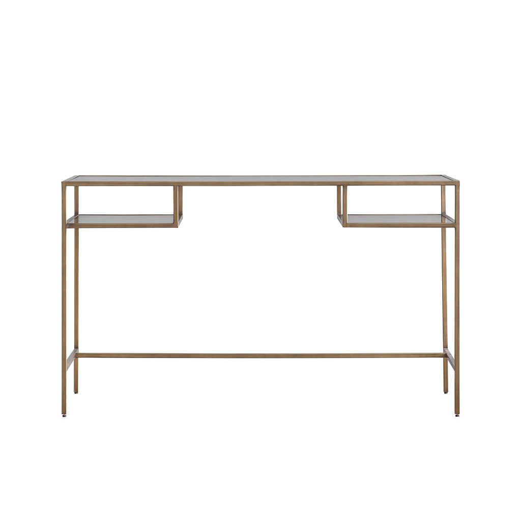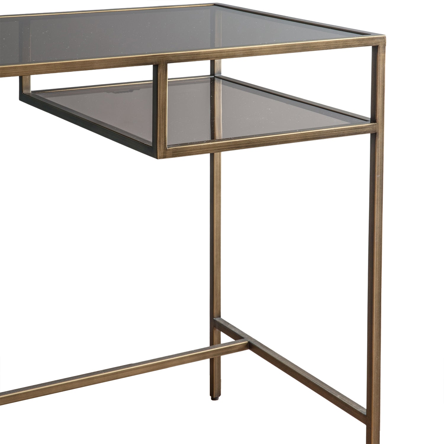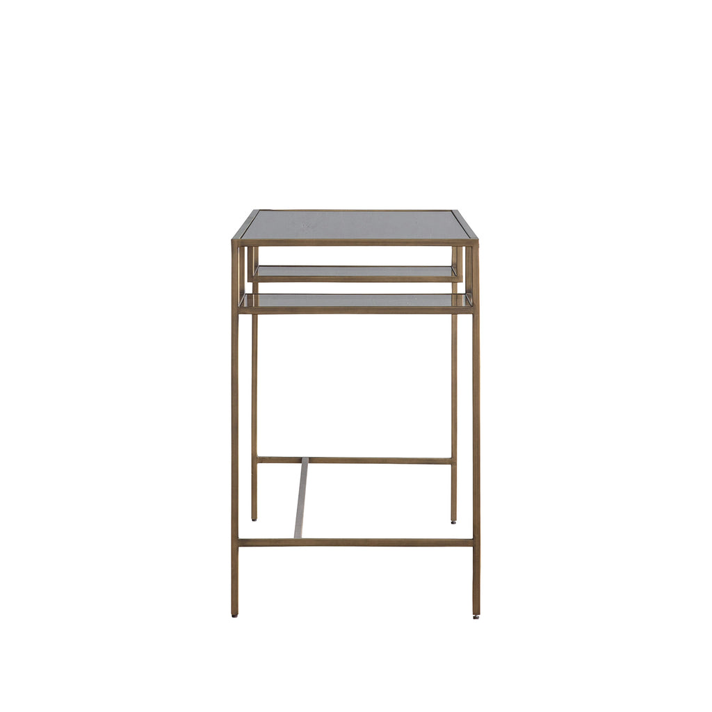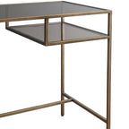 Elevate your workspace with the Ezra Desk in Bronze/Clear. Made with durable glass and iron, it features 2 shelves for convenient storage. The smoked brown tempered glass adds a touch of sophistication. Assembly is required for the top and shelves. Upgrade your office space today!