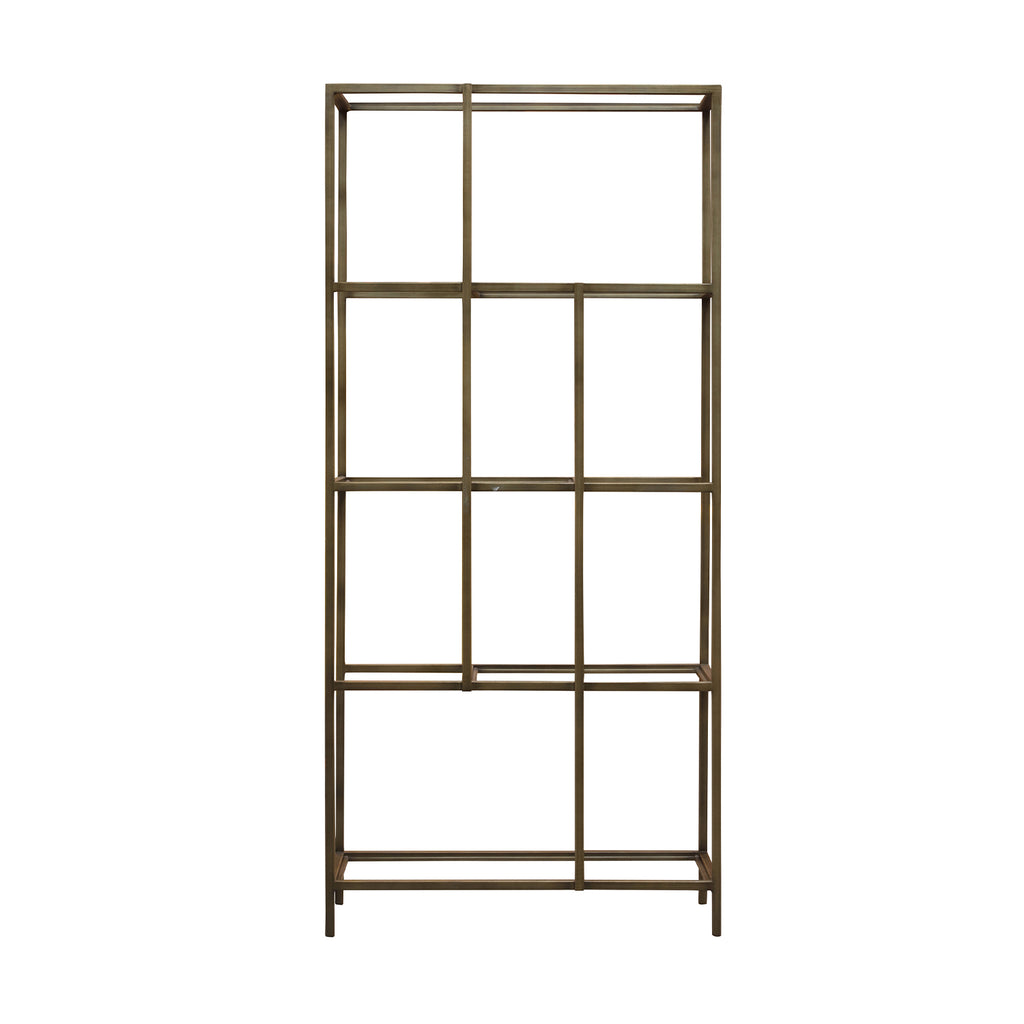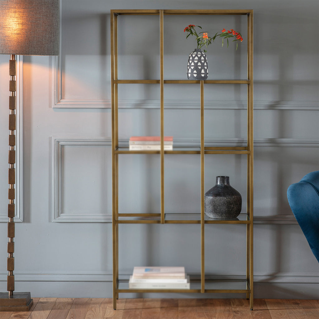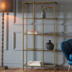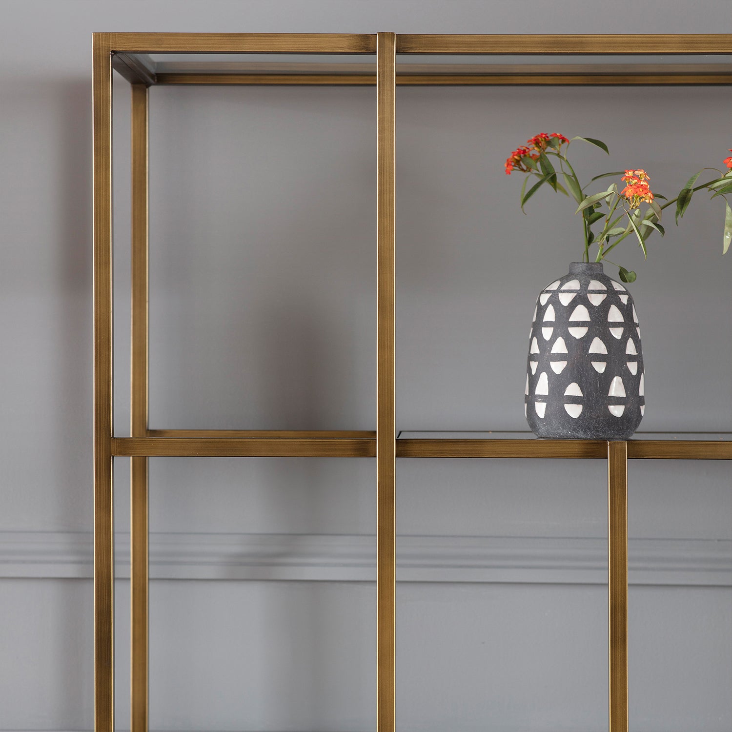 Introducing the Ezra display unit in bronze, a sleek and sophisticated addition to any interior. With its slender metal frame and inlaid clear glass tabletop, this engineered collection adds a touch of elegance to any space. Available in 3 finishes, it's the no.1 choice for a stylish and modern home.