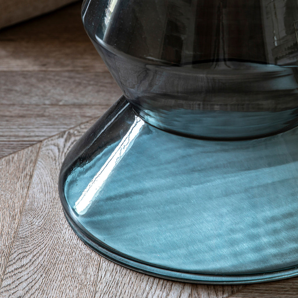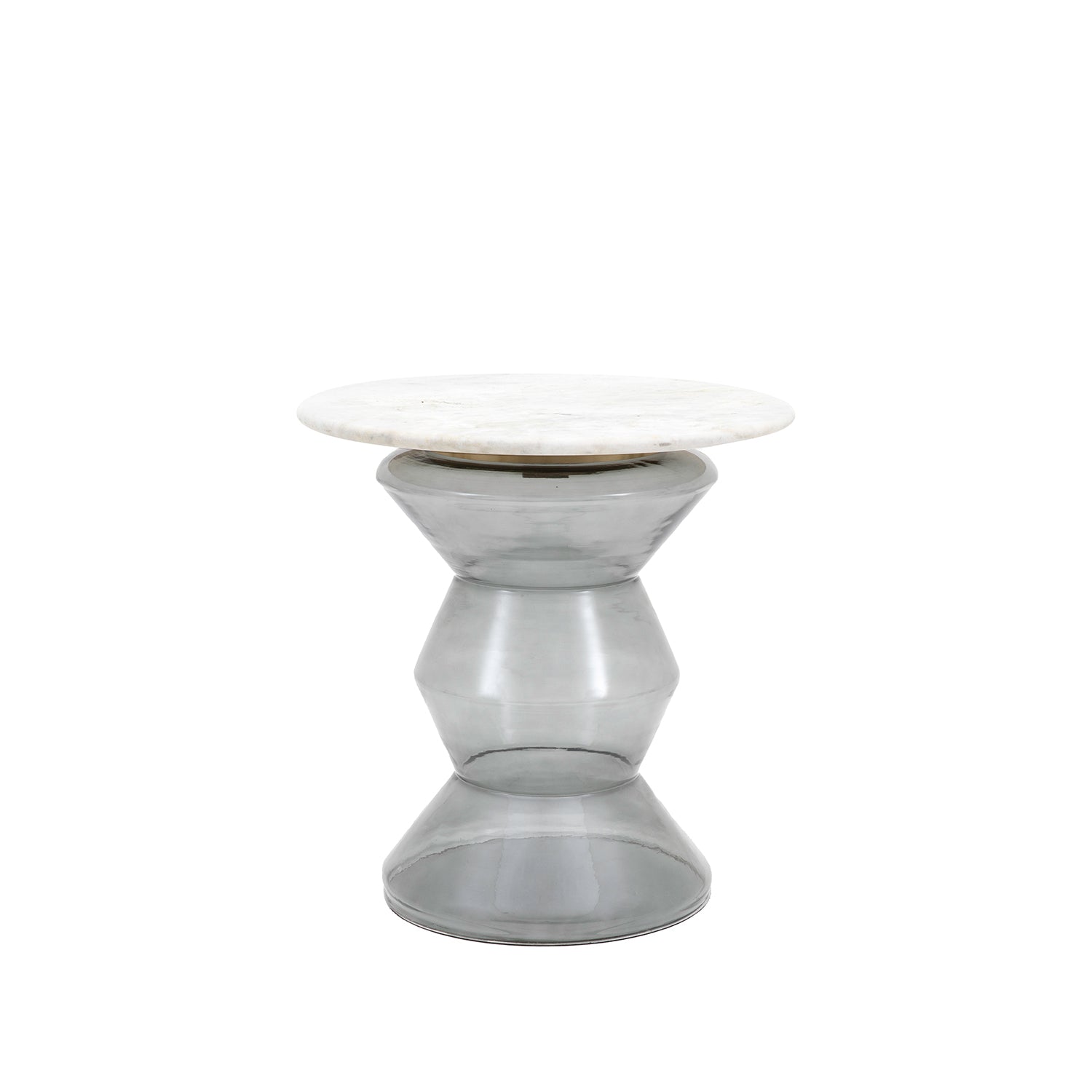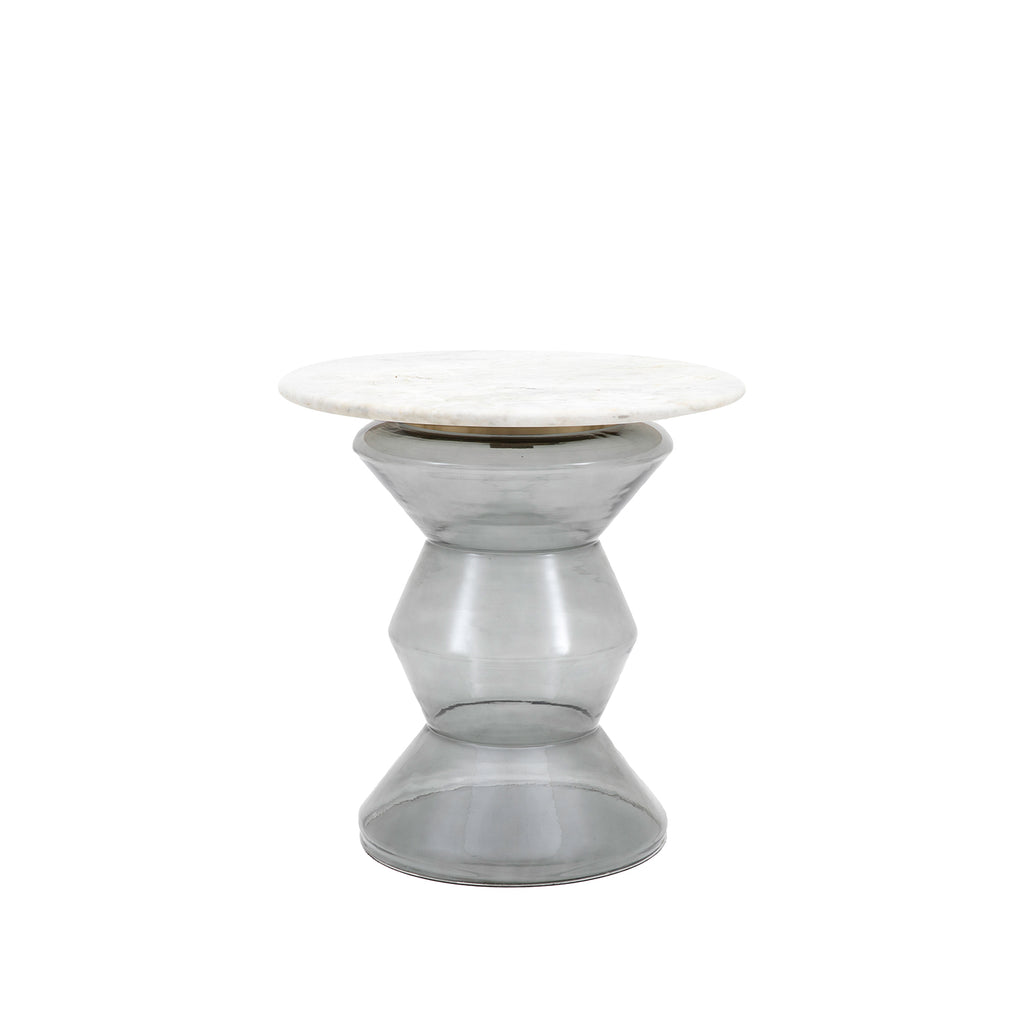 Elevate your living space with the Finnick side table in smoke. This stunning piece features a bold and beautiful glass base, topped with a luxe white marble top and a bronze-toned metal collar. Add a touch of luxury and style to your room with this eye-catching and versatile side table. Available with an orange glass base too!