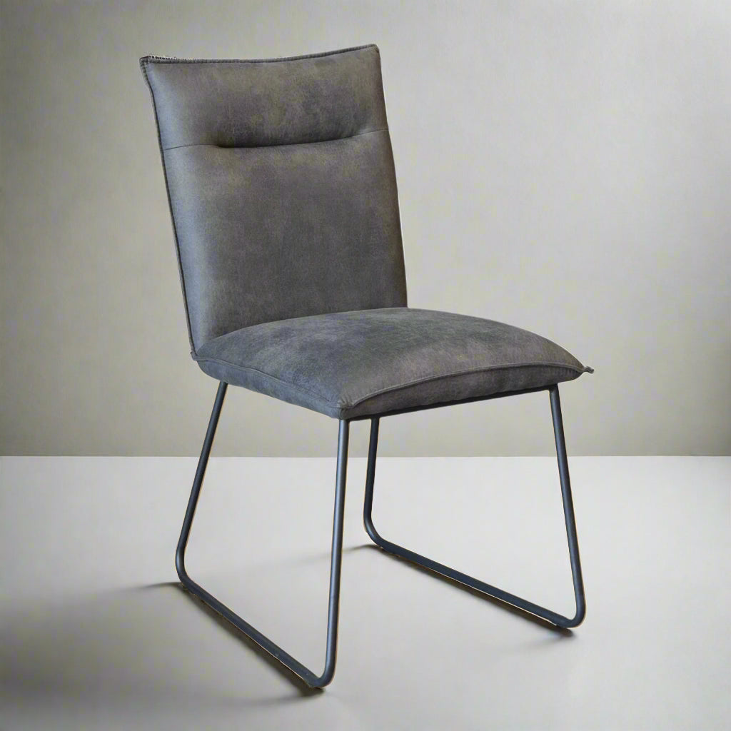 The Grayson dining chair features a deep button upholstered back rest and seat, supported on a metal frame, formed into ski type legs. This configuration provides an extra springiness to the seat, adding to the comfort of the generous padding. The back rest is upright and straight cut and the seat is slightly contoured, giving excellent lumbar support and comfort levels.