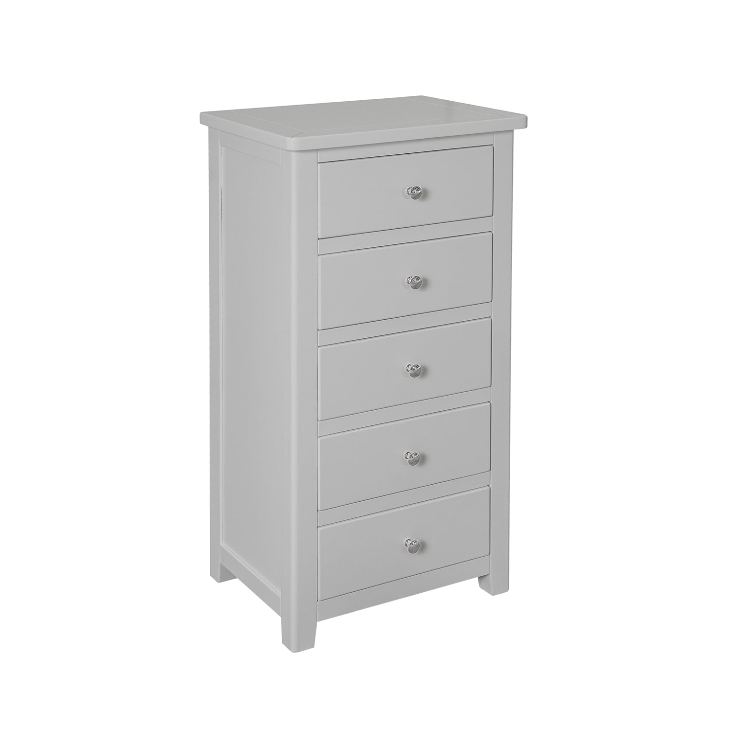 Update your bedroom with the stylish Hambleden 5 Drawer Chest in sleek grey. This contemporary piece of furniture not only adds a touch of modern design to your home, but also provides ample storage space with its 5 spacious drawers. The painted finish adds a modern touch, making this the perfect addition to any bedroom.