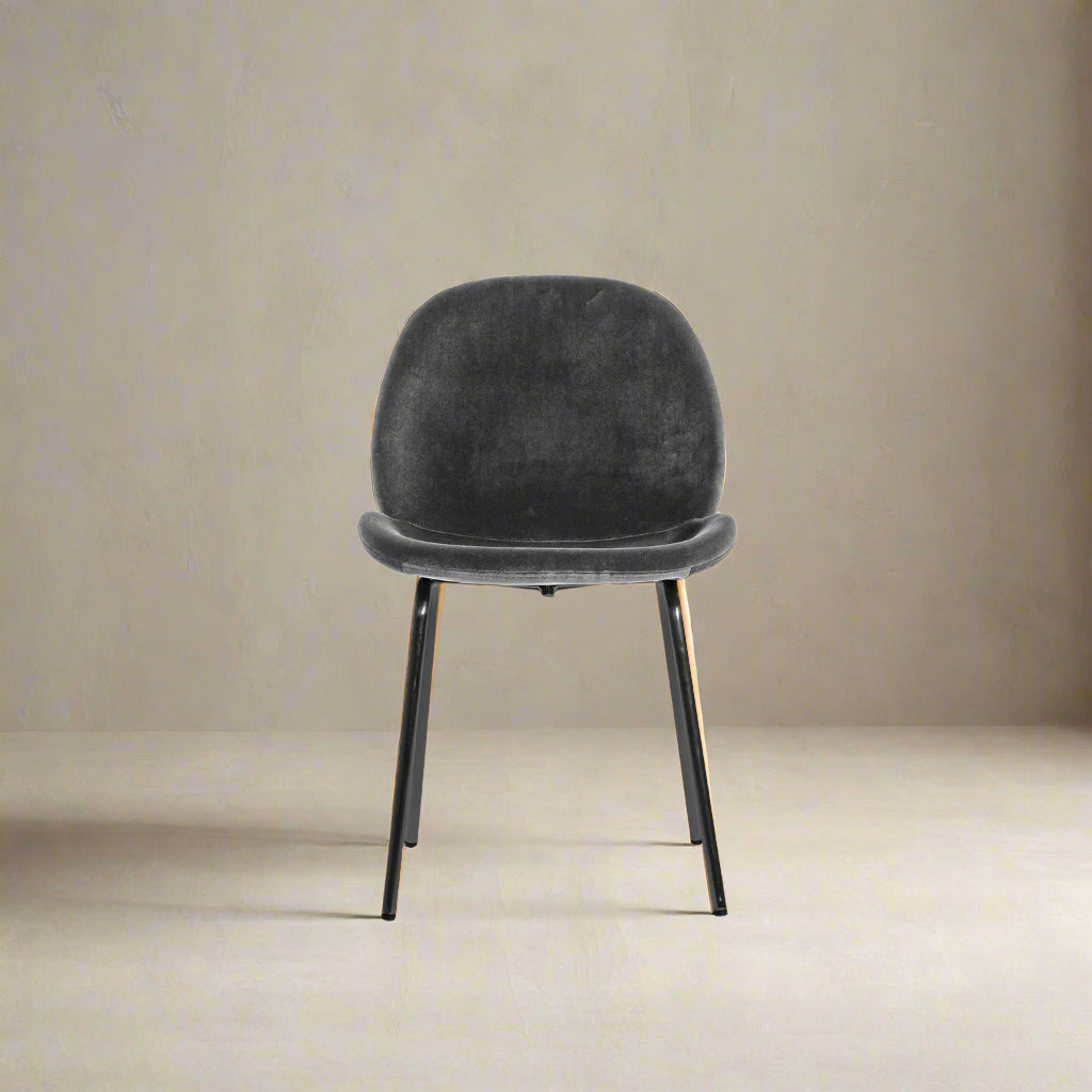 Elevate your dining experience with our Levi Dining Chair in dark grey velvet & pewter. Its steel, plywood, and polyester materials offer durability, while its contemporary styling and warm, sophisticated look add elegance to any space. Also available in other colours and as barstools.