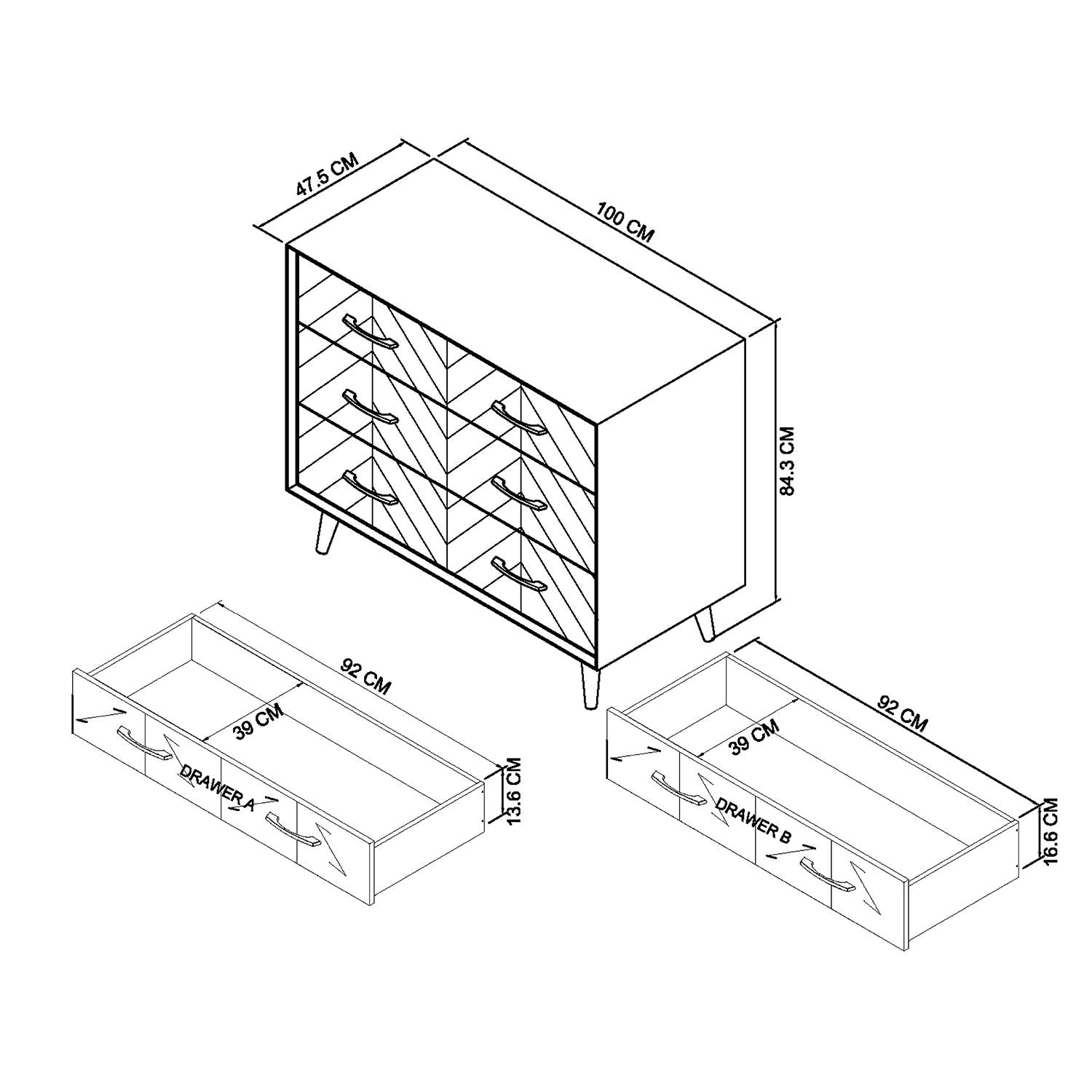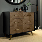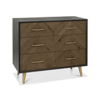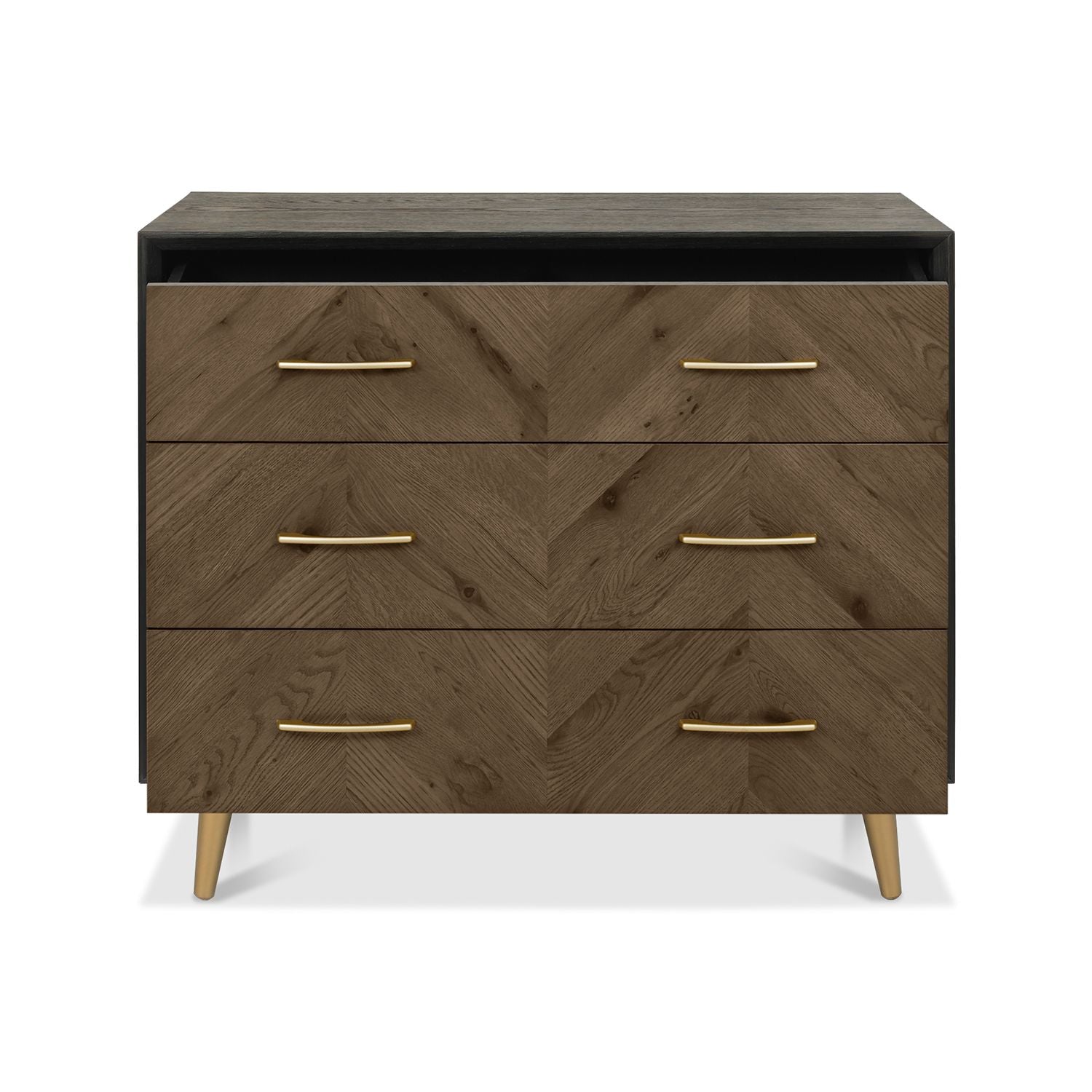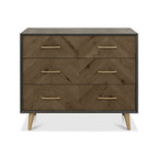 Enhance your decor with the sleek and stylish Murray Hill Fumed Oak & Peppercorn Chest. This 3-drawer design features a chevron pattern, a fumed oak finish, and satin brass handles for a contemporary look. Its conical shaped legs and veneer finish make this chest an eye-catching addition.