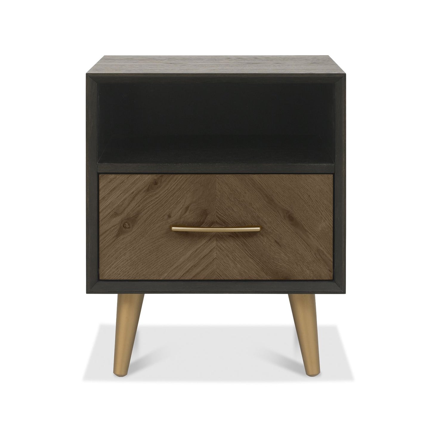 This contemporary nightstand is made of fumed oak veneer with a chevron pattern, and includes a satin brass handle and conical shaped legs. The 1 drawer design features quality construction and ensures ample storage space for your room. Perfect for your modern bedroom.