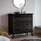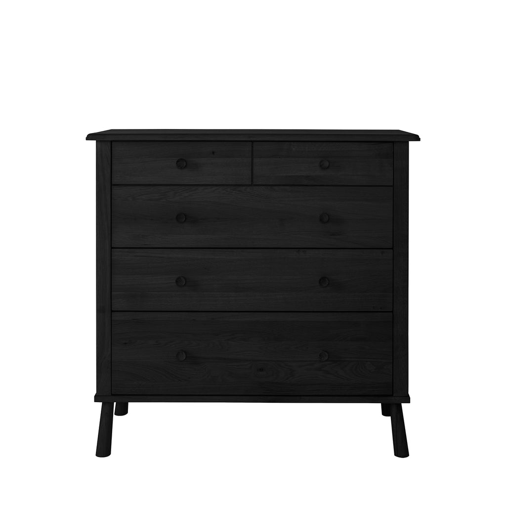 Get organized with the sleek and stylish Shaker 5 Drawer Chest in black. Made with high-quality, oak, and pine, this chest of drawers offers ample storage with its 5 spacious drawers. Keep your belongings tidy and add a touch of elegance to your space.