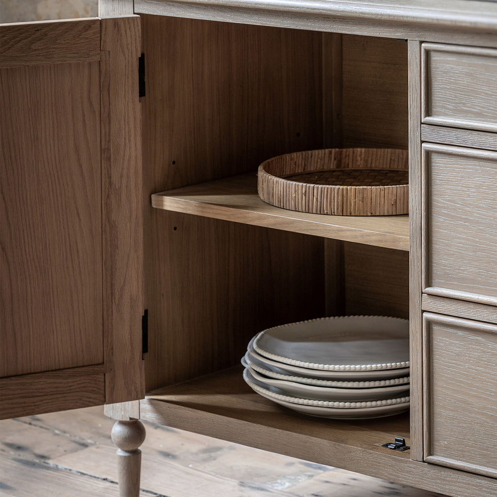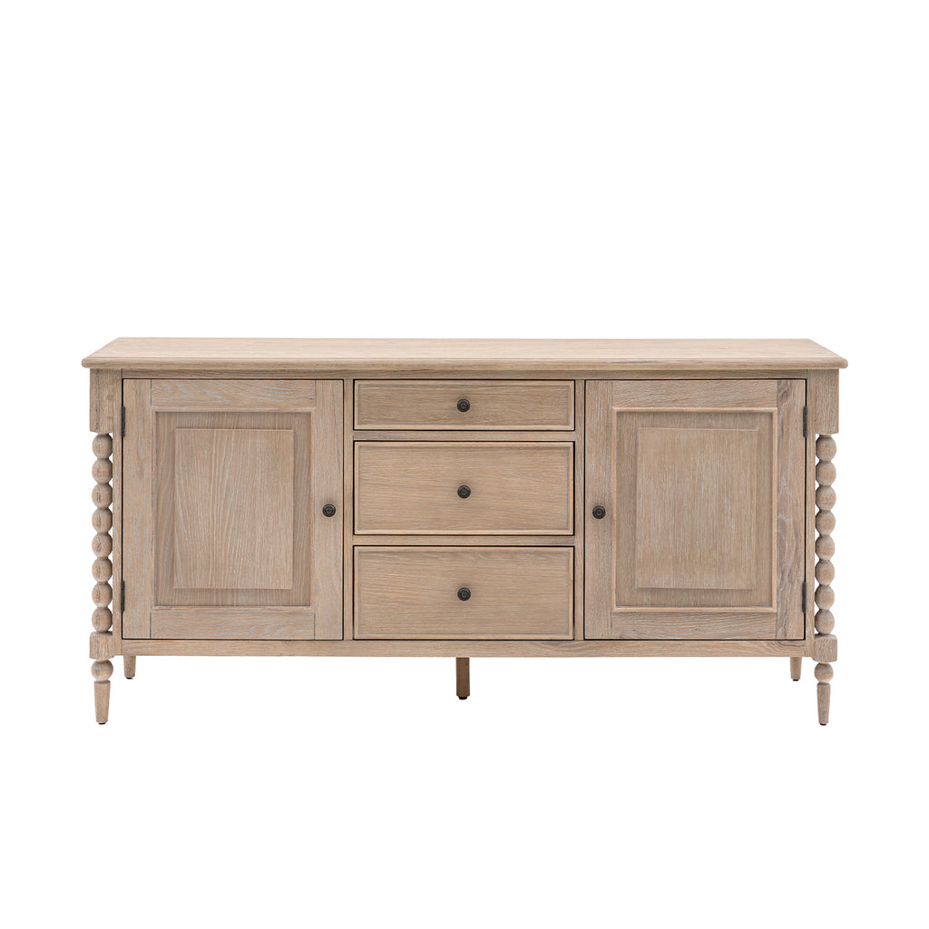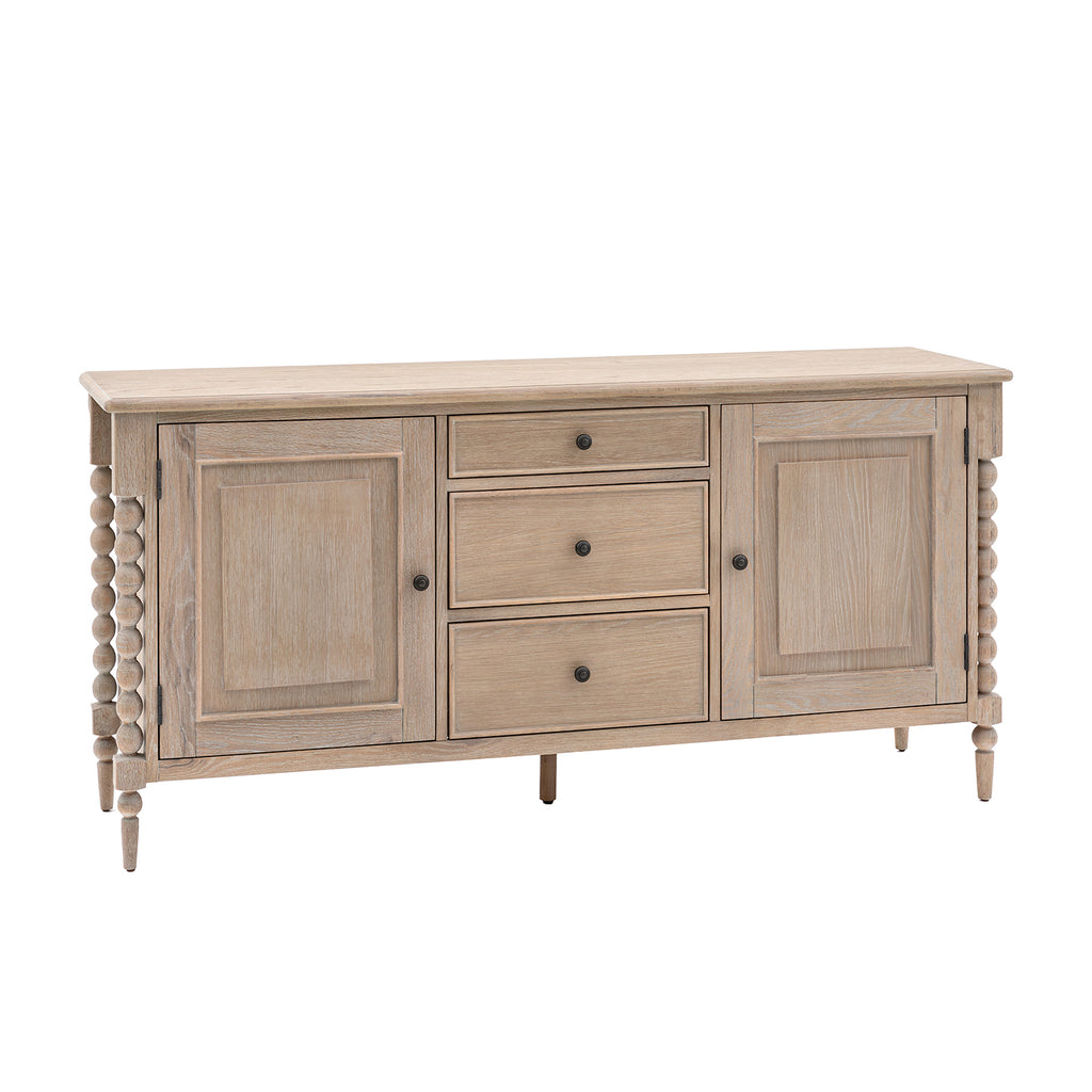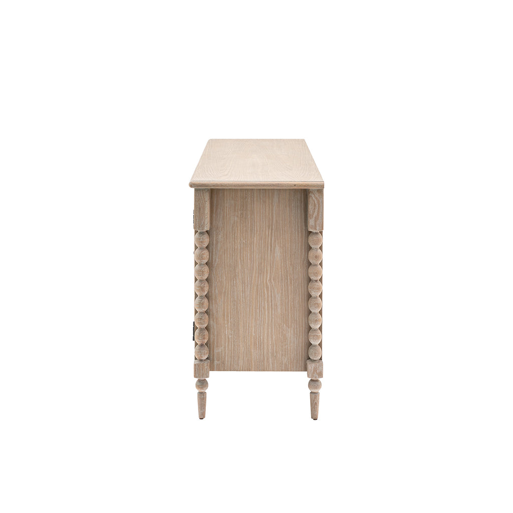 The Wallingford 2 door 3 drawer sideboard offers both practical storage & exquisite design. Its hand-crafted bobbin detail, created by skilled craftsmen, adds a unique touch. The subtle lime wash finish gives it a soft & elegant look. Matching pieces are also available to complete the luxurious feel.