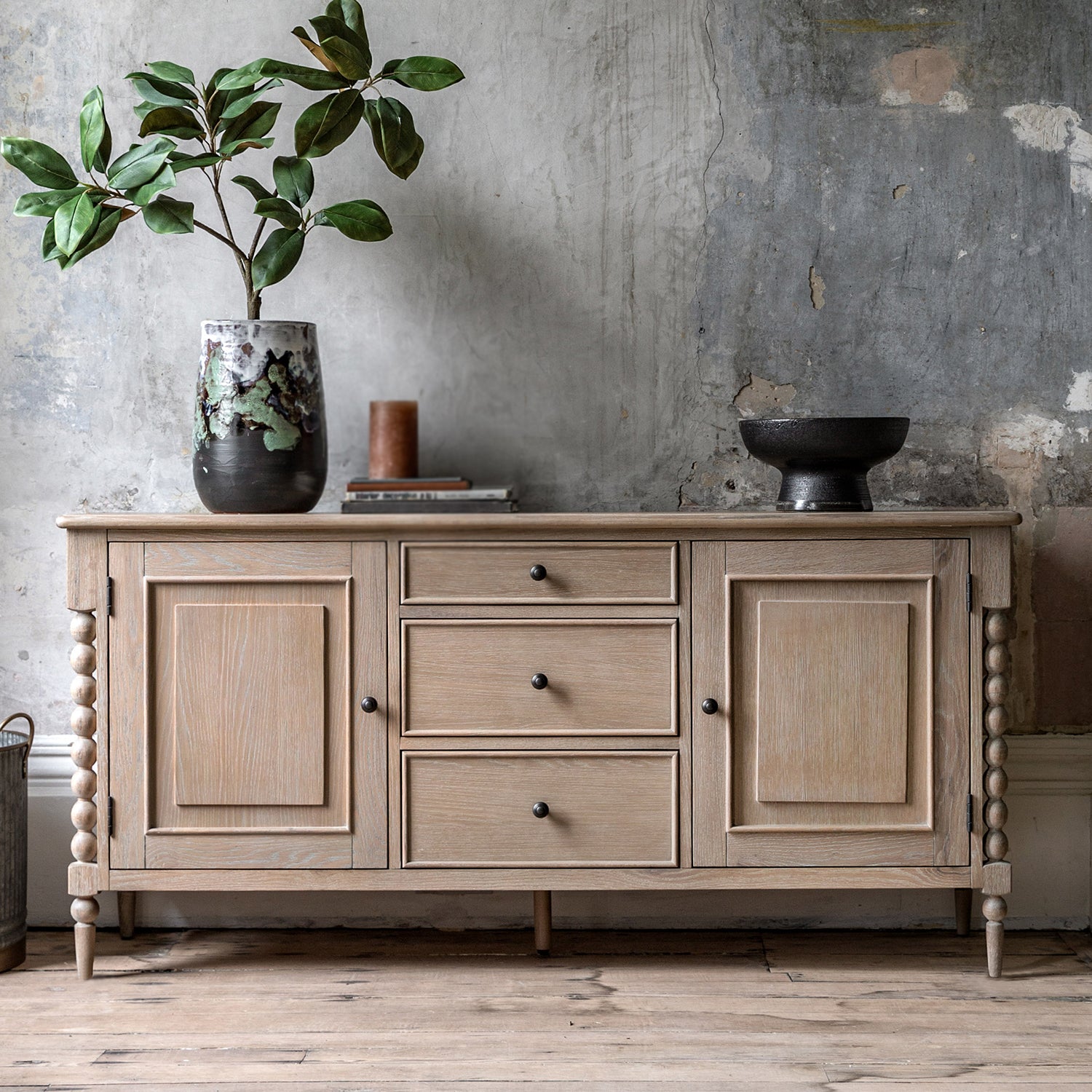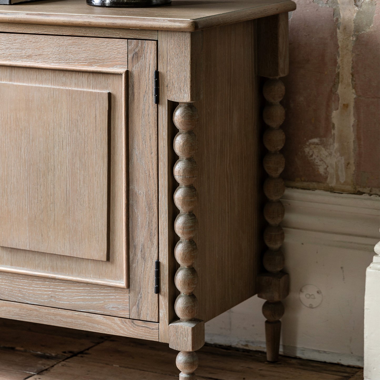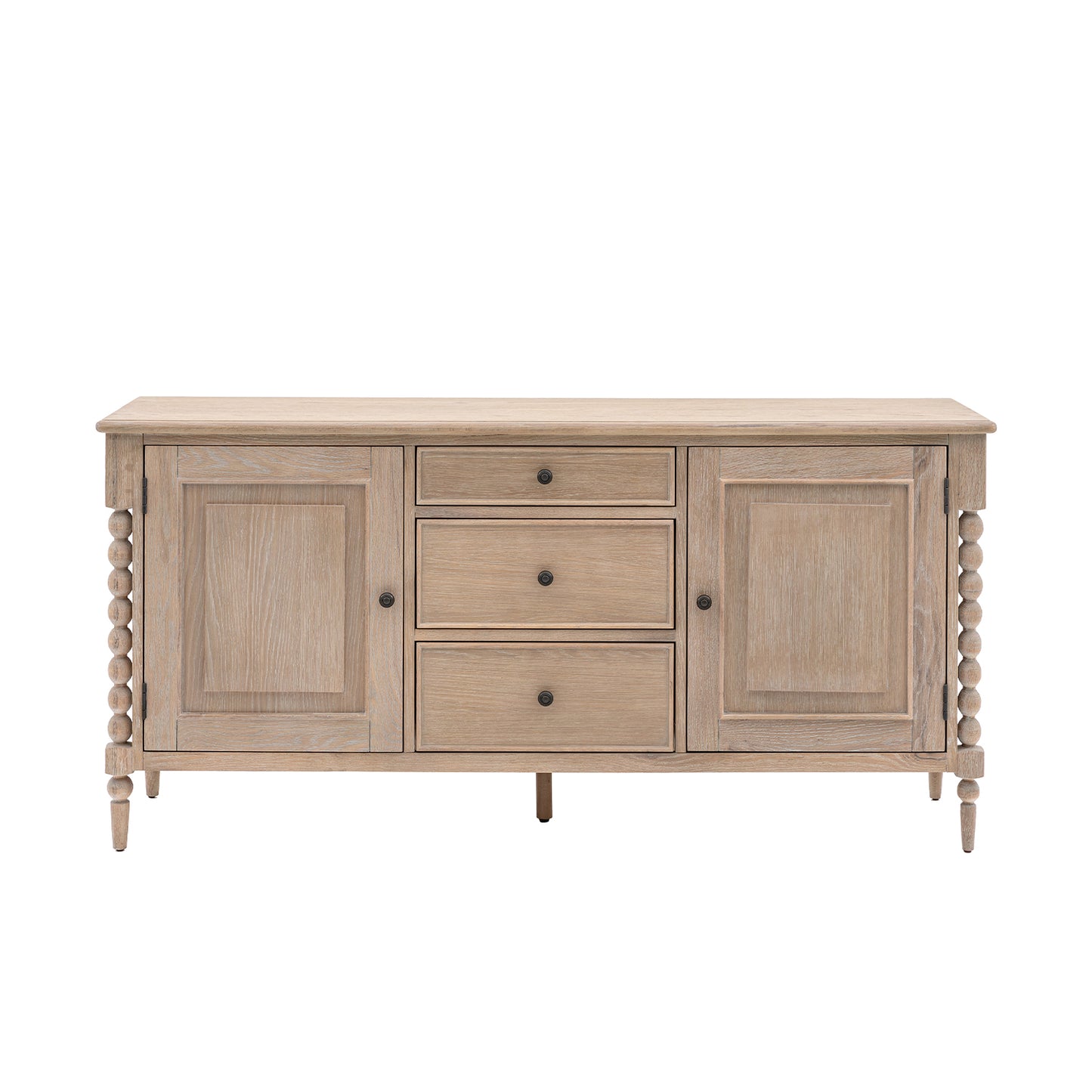 The Wallingford 2 door 3 drawer sideboard offers both practical storage & exquisite design. Its hand-crafted bobbin detail, created by skilled craftsmen, adds a unique touch. The subtle lime wash finish gives it a soft & elegant look. Matching pieces are also available to complete the luxurious feel.